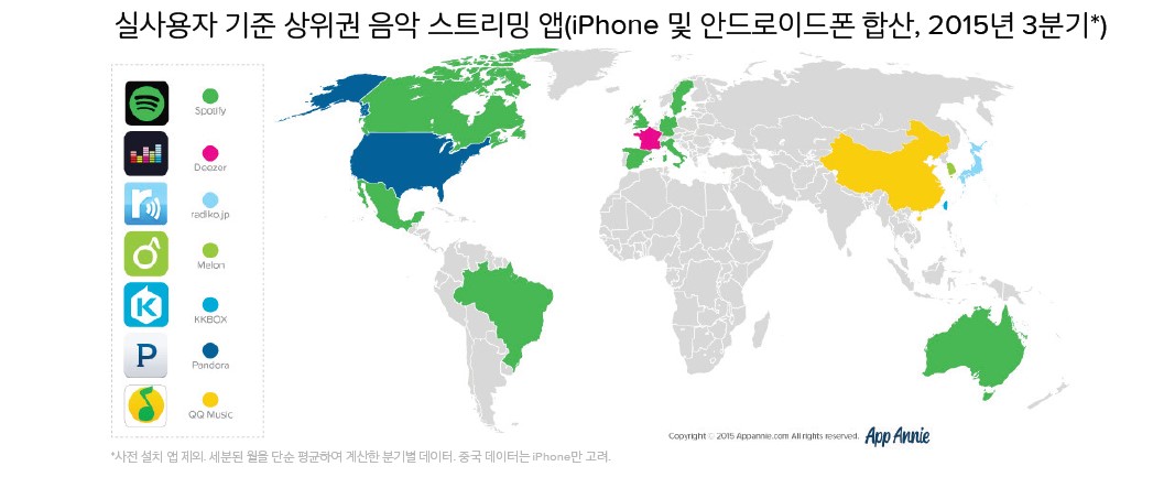 서울--(뉴스와이어) 2015년 12월 02일 -- 세계 최대의 모바일 앱 인텔리전스 플랫폼 앱애니(App Annie, 한국 지사장 정도일, www.appannie.com)는 전세계 음악 스트리밍 앱 상위 순위와 디지털 음악 시장의 트렌드를 살펴볼 수 있는 보고서 ‘디지털 혁명을 이끄는 모바일 음악 스트리밍’ 자료를 발표했다.