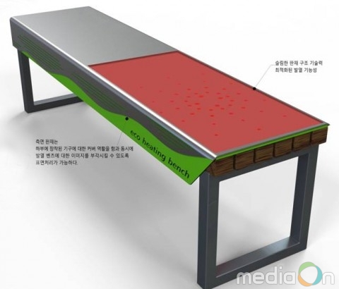 현재 타 지역 시내버스 정류장 등에도 ‘탄소섬유 또는 탄소계 필름 면상발열체를 적용한 발열벤치’가 일부 있지만 이는 열 전달 효율, 즉 40℃까지 열이 오르는 시간이 45분 이상 소요된다. 전자파도 발생되며 설치방법에서도 기존 벤치를 철거해야 하는 번거로움이 있다.