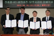 KT는 지난 10일 대전정보문화산업진흥원, 화력대전, 팀넷코리아와 함께 대전진흥원에서 ‘영상 컨텐츠 산업분야 첨단 신기술 서비스 모델 발굴 및 보급 확산을 위한 MOU’를 체결했다고 지난 11일 밝혔다. 참여사들은 이에 따라 KT 5G 네트워크와 클라우드, 10기가 인터넷을 결합한 ‘차세대 영상데이터 관리 기술’을 개발하고 향후 영화와 드라마 촬영 현장에 적용할 예정이다. 특히 "해운대", "국제시장" 등을 제작한 윤제균 감독의 JK필름은 영화 제작비 절감과 효율성 제고를 위해 차기작부터 당 기술을 적극 도입하기로 했다. ‘차세대 영상데이터 관리 기술’을 사용하면 원거리에서 촬영된 영상을 하드디스크에 복제해 원거리 작업실에 배송하던 방식에서 벗어나, 5G와 10기가 인터넷 등 초고속 데이터 통신망과 클라우드 서버를 활용해 언제 어디서나 신속하게 영상을 전달받고 작업할 수 있다. 이날 협약식에는 KT 김봉균 Biz사업본부장, 대전진흥원 최경목 원장 직무대행, 화력대전 옥임식 대표 이사, 팀넷코리아 손현철 대표 이사 등 주요 관계자들이 참석했다. KT Biz사업본부장 김봉균 상무는 “KT 5G 네트워크와 10기가 인터넷을 기반으로 한 콘텐츠 관