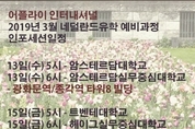 해외대학지원 및 어학연수 등록 유학사무소인 어플라이 인터내셔널이 3월 중에 진행될 네덜란드유학 인포세션 일정을 발표했다. 높은 교육수준과 더불어 영국, 미국 등 다른 영어권 국가와 비교해 학비 부담이 적어 학생들과 부모님들의 관심이 많아지고 있는 네덜란드유학에 대해 좀 더 정확한 정보를 전달하기 위해 각 인포세션에는 해당 학교들의 한국지사 담당자들도 참석해 운영하는 과정, 학비, 생활비, 지원방법, 수속절차, 졸업 후 진로 등에 대해 자세히 안내할 예정이다.